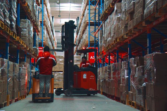 有操作著叉車在倉中穿梭的狂拽工作人員