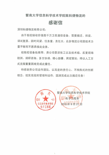 我們的方案精密設(shè)計了每一步過程,最終搬遷非常成功,暨大的老師對我們的工作給出了極大的肯定,并發(fā)來了表揚信肯定科捷做出的努力,還表示今后類似的業(yè)務(wù)需求全部交給科捷完成。
