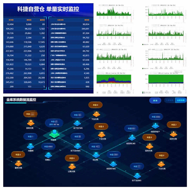 科捷專門為雙十一開發的KingKooData系統數據流監控,對訂單流入到系統后的各操作節點待流轉數據可進行實時監控。就好比監控一條大河和分支的小河,河道哪里有堵塞,是發貨后回傳客戶系統慢還是下發TMS有堵塞,在監控上都能一目了然的觀察到。通過KingKooData數據流的監測,技術人員可以及時發現與客戶系統接口是否有異常,及時聯系到客戶處理。也能提醒客戶經理和倉儲管理者,哪些單據因為操作不完整導致了單據滯留未往下一個環節流轉。日常和雙十一大促期間,通過這個工具實時觀察數據流,起到了數據防呆的作用,確保了每一單數據都能正常流轉。