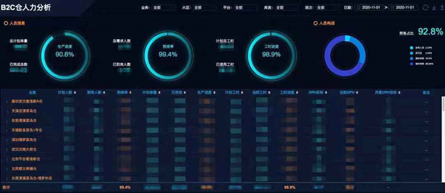 此次雙十一,科捷KingKooData人力用工管理系統根據銷量預測,精準的預安排了全國近三萬名臨時勞務的派工和管理。這是保障各倉高效發貨的關鍵舉措。系統將前臺供應商門戶與供應商管理系統進行對接,在中臺設置人力管理平臺,連接后臺核算管理系統,將大促的人力管理線上流程化,同時將用工申請、用工確認、對賬、報價、付款等各環節相互關聯,降低法務、財務風險。且倉內效能由系統進行統計與計算,降低了目前人工計算的錯誤率與統計工作量。每個倉庫的實時UPH進度和崗位人效一目了然,無需到現場既可運籌帷幄,實現了全國一盤棋。